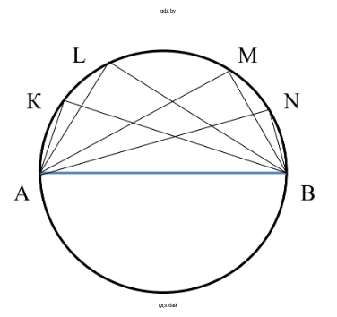 Ответ: Величина каждого из углов $\angle AKB, \angle ALB, \angle AMB$ и $\angle ANB$ равна $90^\circ$.