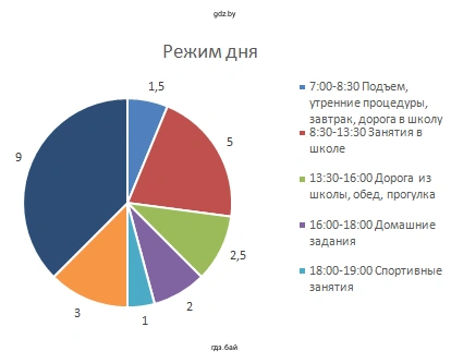 - Найти, какой угол на круговой диаграмме (полный круг — $360^\circ$) соответствует каждой доле. Угол сектора вычисляется по формуле: $Угол = (\frac{\text{Продолжительность деятельности в часах}}{24 \text{ часа}}) \times 360^\circ$.