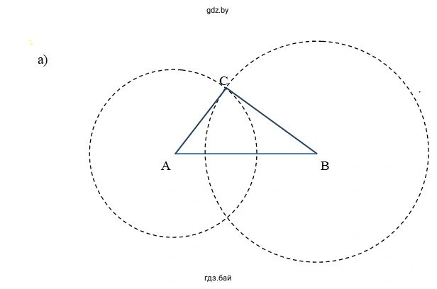 - Точка пересечения двух дуг является третьей вершиной треугольника, обозначим ее буквой C. Эта точка удовлетворяет обоим условиям: она удалена от A на 3 см и от B на 4 см. (Обычно получается две точки пересечения, можно выбрать любую из них).