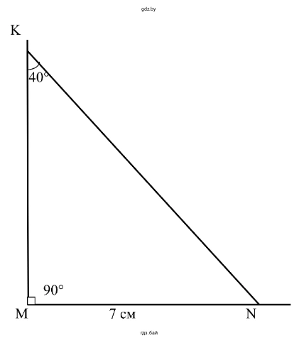 $\angle N = 180^\circ - \angle M - \angle K = 180^\circ - 90^\circ - 40^\circ = 50^\circ$. - С помощью линейки построим отрезок $MN$ длиной 7 см.