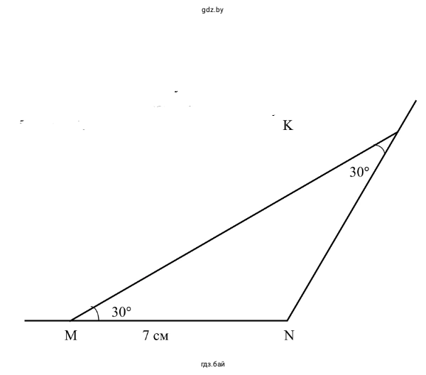 $\angle N = 180^\circ - \angle M - \angle K = 180^\circ - 30^\circ - 30^\circ = 120^\circ$. - С помощью линейки построим отрезок $MN$ длиной 7 см.
