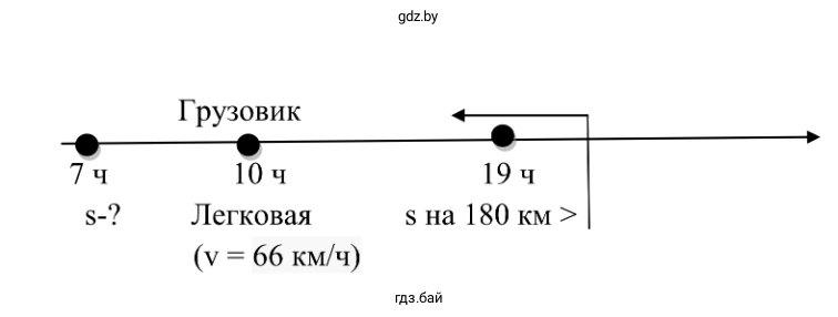 1. Сначала найдем относительную скорость автомобилей. В 10:00 легковой автомобиль догнал грузовой. Это означает, что в этот момент расстояние между ними было равно нулю. В 19:00 легковой автомобиль опережал грузовой на 180 км. Промежуток времени между этими двумя моментами составляет: $t_1 = 19 \text{ ч} - 10 \text{ ч} = 9 \text{ ч}$ За эти 9 часов расстояние между автомобилями увеличилось на 180 км. Скорость, с которой легковой автомобиль удалялся от грузового (относительная скорость), равна: $v_{отн} = v_л - v_г = \frac{S_1}{t_1} = \frac{180 \text{ км}}{9 \text{ ч}} = 20 \text{ км/ч}$