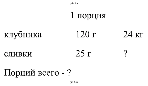 1.29. На одну порцию десерта из клубники берут 120 г ягод и 25 г сливок. Сколько килограммов сливок потребуется для приготовления десерта из 24 кг клубники? Сколько порций получится?