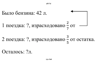 В баке было 42 л бензина. Согласно условию, во время первой поездки было израсходовано $\frac{2}{7}$ всего количества. Чтобы найти эту величину, умножим общее количество бензина на данную дробь:
