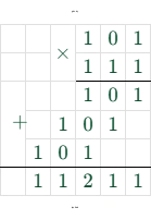$101 \cdot 111 = (100 + 1) \cdot 111 = 100 \cdot 111 + 1 \cdot 111 = 11100 + 111 = 11211$