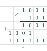 $1001 \cdot 101 = 1001 \cdot (100 + 1) = 1001 \cdot 100 + 1001 \cdot 1 = 100100 + 1001 = 101101$