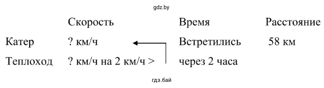 2.146. От двух пристаней на озере одновременно по одному маршруту навстречу друг другу вышли катер и теплоход. Найдите их скорости, если расстояние между пристанями 58 км, скорость теплохода на 2 км/ч больше скорости катера, и встретились они через 2 ч.