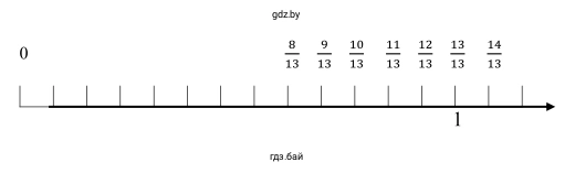 Затем отложим от начала координат (точки 0) соответствующее количество таких частей для каждой дроби. Например, дробь $\frac{8}{13}$ будет находиться на расстоянии 8 таких частей от нуля. Дробь $\frac{13}{13}$ совпадет с точкой 1.