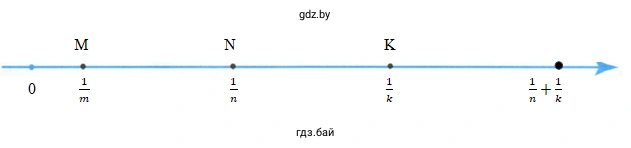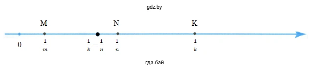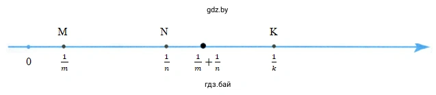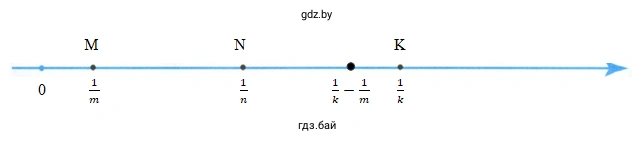 Для решения этой задачи мы будем использовать геометрическую интерпретацию сложения и вычитания чисел на координатной прямой. Нам даны точки $ M(\frac{1}{m}) $, $ N(\frac{1}{n}) $ и $ K(\frac{1}{k}) $. Координата каждой точки представляет собой расстояние от начала координат (точки 0) до этой точки. Таким образом, длина отрезка OM равна $ \frac{1}{m} $, длина отрезка ON равна $ \frac{1}{n} $, а длина отрезка OK равна $ \frac{1}{k} $.