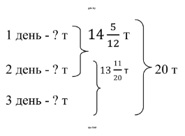 Ответ: за первый рейс самосвал перевёз $6\frac{9}{20}$ т, за второй — $7\frac{29}{30}$ т, за третий — $5\frac{7}{12}$ т.