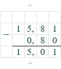 $15,81 - 0,8 = 15,81 - 0,80 = 15,01$