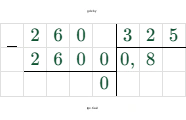 $2,6 : 3,25 = \frac{2,6}{3,25} = \frac{260}{325} = \frac{260 \div 65}{325 \div 65} = \frac{4}{5} = 0,8$