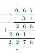 - Отделить запятой столько цифр справа, сколько их стоит после запятой в обоих множителях вместе. В числе $3.4$ одна цифра после запятой, в числе $0.67$ — две. Всего $1 + 2 = 3$ цифры.