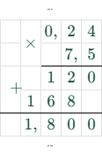 В исходных множителях (0,24 и 7,5) общее количество знаков после запятой равно трем (два у 0,24 и один у 7,5). Отделяем три знака справа в произведении 1800, получаем $1,800$, что равно $1,8$.