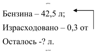 Согласно условию, было израсходовано 0,3 от общего количества бензина, которое составляло 42,5 литра. Чтобы найти абсолютное значение расхода в литрах, нужно умножить общее количество на долю расхода: