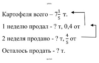 Изначальное количество картофеля составляет $7\frac{1}{5}$ тонны. Для удобства расчетов переведем смешанную дробь в десятичную: