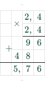 1) 2,4 • 2,4 = 5,76 (см2) – площадь основания;