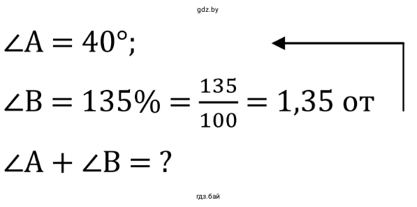 По условию, угол A равен $40^\circ$. Угол B составляет $135\%$ от угла A. Чтобы найти величину угла B, необходимо перевести проценты в десятичную дробь и умножить на градусную меру угла А.