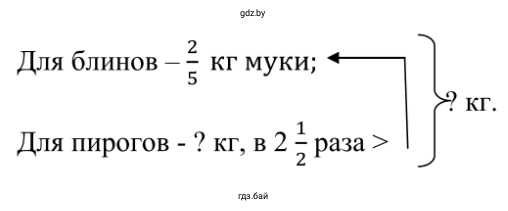 В условии сказано, что для выпечки пирогов потребовалось в $2\frac{1}{2}$ раза больше муки, чем для блинов. На блины ушло $\frac{2}{5}$ кг муки. Чтобы найти количество муки для пирогов, нужно умножить количество муки для блинов на $2\frac{1}{2}$.