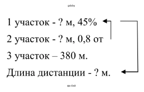 2.501. Длина первого из трёх участков беговой дистанции эстафеты по лёгкой атлетике составляла 45 % длины всей дистанции, длина второго участка — 0,8 от длины первого. Чему равна длина всей дистанции, если длина третьего участка составила 380 м?