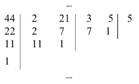 Найдем НОД для чисел 44, 21 и 5. Разложим каждое число на простые множители.