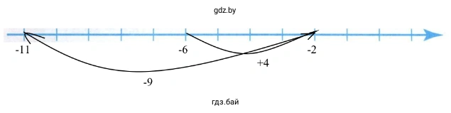 3. Третье слагаемое +(-9). Это равносильно перемещению на 9 единиц влево из точки -2. $-2 - 9 = -11$. Попадаем в точку -11.