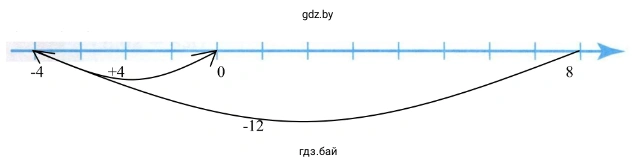 3. Из точки 4 прибавляем -8, то есть перемещаемся на 8 единиц влево. $4 - 8 = -4$. Попадаем в точку -4.