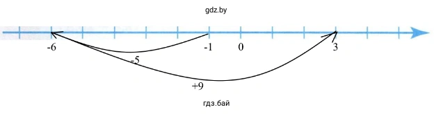 3. Из точки -6 прибавляем 9, то есть перемещаемся на 9 единиц вправо. $-6 + 9 = 3$. Попадаем в точку 3.