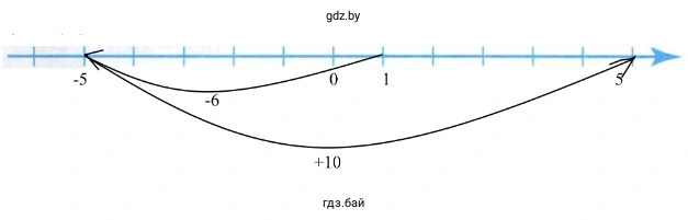 2. Из точки 1 прибавляем -6, то есть перемещаемся на 6 единиц влево. $1 - 6 = -5$. Попадаем в точку -5.