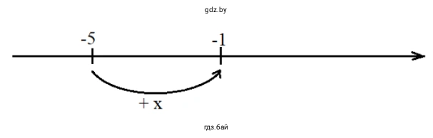 а) Чтобы решить уравнение $ -5 + x = -1 $ с помощью координатной прямой, представим это как движение. Мы начинаем в точке с координатой $-5$. Прибавление неизвестного числа $x$ — это смещение по прямой. Результат, $-1$, — это конечная точка нашего движения. Чтобы из точки $-5$ попасть в точку $-1$, нужно двигаться вправо. Величина смещения равна разности конечной и начальной координат: $x = -1 - (-5) = -1 + 5 = 4$. Движение вправо на 4 единицы соответствует прибавлению положительного числа 4. Таким образом, $x=4$.