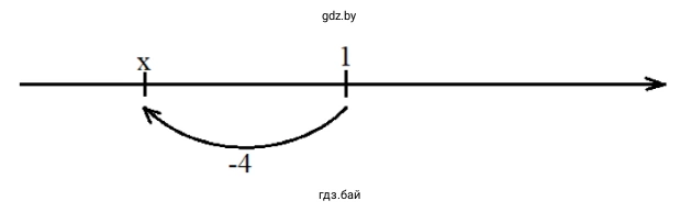 б) Уравнение $x + (-4) = 1$ можно переписать как $x - 4 = 1$. На координатной прямой это означает, что мы начинаем движение из неизвестной точки $x$, смещаемся на 4 единицы влево (потому что вычитаем 4) и оказываемся в точке $1$. Чтобы найти начальную точку $x$, нужно выполнить обратное действие: из конечной точки $1$ переместиться на 4 единицы вправо (то есть прибавить 4). $x = 1 + 4 = 5$.