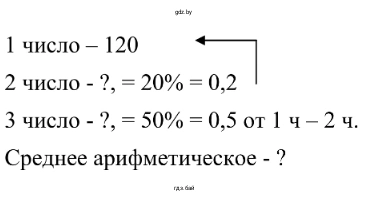 4.303. Найдите среднее арифметическое чисел, если первое число 120, второе составляет 20 % первого, а третье составляет 50 % разности первого и второго чисел.