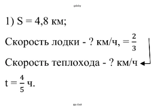 4.389. 1) Сейчас между теплоходом и лодкой 4,8 км. Скорость лодки составляет 23 скорости теплохода. Найдите скорости лодки и теплохода, если известно, что теплоход догонит лодку через 45 ч.