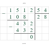 1. Сначала выполним деление в скобках: $151,2 : 5,4$. Перенесем запятую в обоих числах на один знак вправо: $1512 : 54 = 28$.