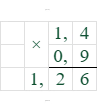 1. Первое действие - умножение: $-1,4 \cdot 0,9$. Произведение отрицательного и положительного чисел отрицательно: $1,4 \cdot 0,9 = 1,26$. Следовательно, результат равен $-1,26$.
