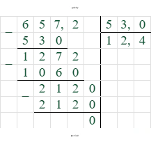 $65,72 : 5,3 = 657,2 : 53 = 12,4$