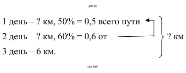 6.11. В первый день туристы прошли 50 % намеченного пути, во второй день – 60 % пути, пройденного в первый день, а в третий день они преодолели последние 6 км пути. Сколько километров составлял весь маршрут туристов?