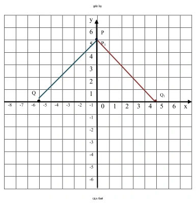 Для решения задачи сначала определим координаты исходных точек: $P(0; 5)$ и $Q(-5; 0)$. Чтобы построить отрезок, симметричный данному, нужно найти координаты его концов, которые симметричны концам исходного отрезка, и соединить их.