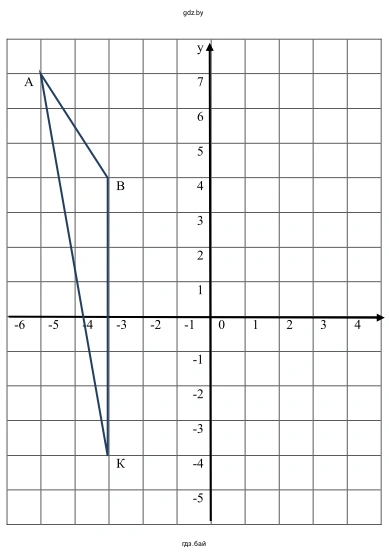Для решения задачи необходимо сначала отметить точки $A(-5; 7)$, $B(-3; 4)$ и $K(-3; -4)$ на координатной плоскости и соединить их отрезками. В результате получится треугольник $ABK$. Далее, согласно заданию, нужно измерить его углы. Поскольку выполнить точное измерение с помощью транспортира на экране невозможно, мы проведем математические вычисления для нахождения точных значений углов. Эти вычисления дадут результат, который можно было бы получить при помощи идеального транспортира.