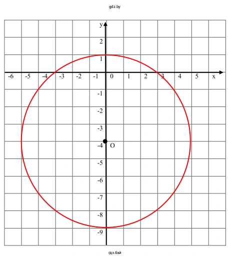 Согласно условию, центр окружности находится в точке $O(0; -4)$, а её радиус $R$ равен 5 единичным отрезкам. Подставим эти значения в общую формулу: