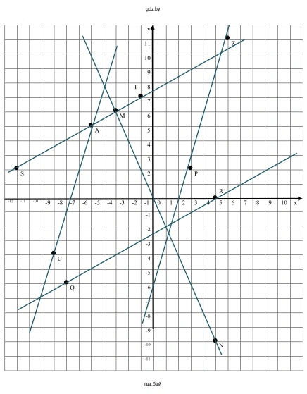 П.65. Отметьте точки М(−3; 6), А(5; −10), Q(−7; −6), R(5; 0), S(−11; 2), T(−1; 7), Р(3; 2), Z(6; 11), А(−5; 5) и С(−8; −4) на координатной плоскости. Проведите прямые MN, QR, ST, PZ и АС. С помощью чертёжного треугольника и линейки найдите прямые, параллельные и перпендикулярные друг другу. Определите по рисунку координаты точки пересечения прямой PZ с осью у и прямой QR с осью х.