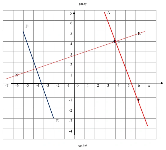 П.90. На координатной плоскости отметьте точку С(4; 4) и начертите отрезок DE, если D(–5; 5) и Е(–2; –3). Проведите через точку С прямую NK, перпендикулярную прямой DE, и прямую АР, параллельную прямой DE.
